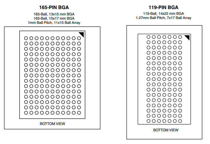 Density | org. | Part Number | Vcc | VccQ | Speed(Mhz) | tKQ(ns) | Pkg(Pins) |