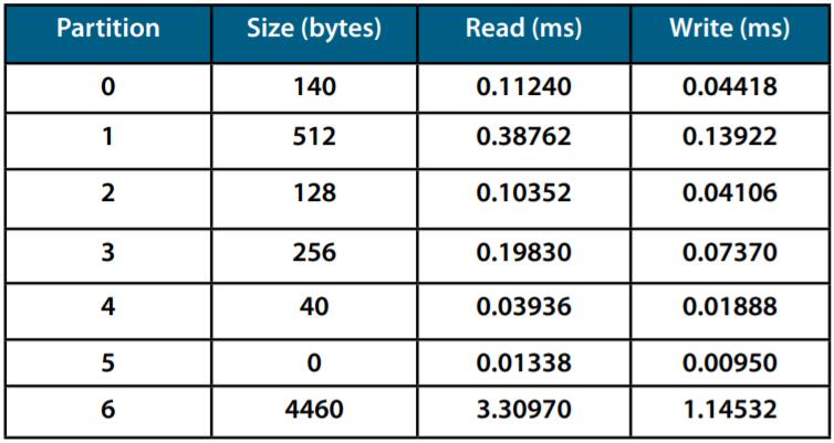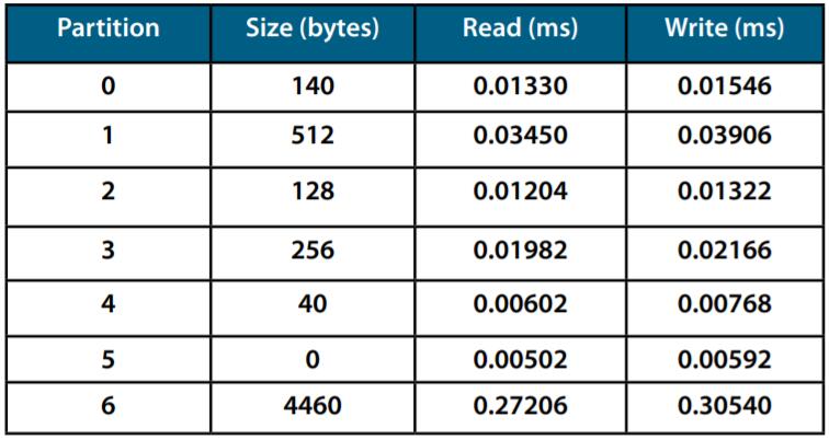 MRAM低級驅動程序通過操作系統和調度程序集成到動力總成應用程序中。讀寫周期由系統時鐘(300MHz)測量。圖1&2顯示了針對動力總成應用的具有不同非易失性存儲器接口的每個分區的讀/寫時間。這些表顯示大多數讀/寫周期小于2ms。毫不奇怪,該表確認35ns并行接口以比40MHz