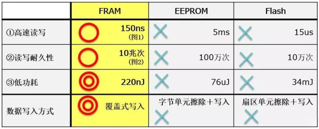富士通FRAM主要具備三大優(yōu)勢:高讀寫入耐久性、高速寫入以及低功耗,這是絕大多數同類型存儲器無法比擬的。比如FRAM寫入次數壽命高達10萬億次,而EEPROM僅有百萬次(10^6)。