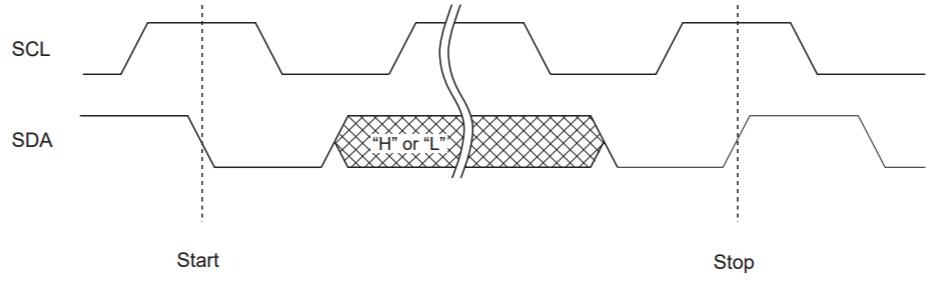 I2C總線僅通過(guò)兩條線提供通信,因此,當(dāng)SCL為“L”電平時(shí),SDA輸入應(yīng)改變。但是,在啟動(dòng)和停止通信序列時(shí),SDA允許更改,而SCL為“H”電平。