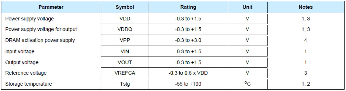 3. VDD和VDDQ始終必須在300mV之內。當VDD和VDDQ小于500mV時,VREFCA必須不大于0.6×VDDQ;VREFCA可以等于或小于300mV。