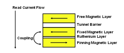 飛思卡爾半導(dǎo)體還通過增加兩個附加層來改進(jìn)固定磁性層。在固定層下面增加了一層釕(Ru)。而在Ru層下面又增加了另一層稱為牽制層(pinning layer)的磁性層。固定層和牽制層的極性相反,將會引起很強的耦合。該強耦合使固定層的極性保持鎖定,因此不會在編程操作過程中引起誤反轉(zhuǎn)(圖4)。